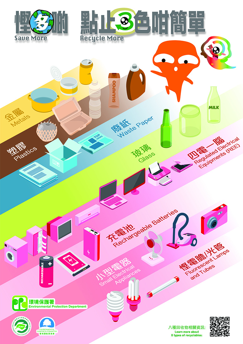 The Campaign promotes various themes in phases. The first phase highlights different types of recyclables and community recycling network. The EPD promotes the green living concept of “Save More, Recycle More” by expanding its recycling network through the addition of outlets in the community and the collection of more recyclable types, including glass bottles, fluorescent lamps and tubes, rechargeable batteries, small electrical appliances, and regulated waste electrical and electronic equipment.